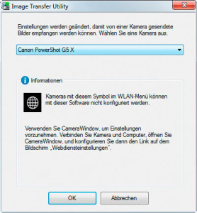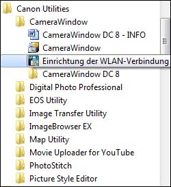 Damit die Synchronisation zwischen Kamera und Computer funktioniert, muss die Canon Software Camera Window auf Ihrem Computer installiert sein, die sich im Softwarepaket Ihrer Kamera befindet oder von den Support-Seiten von Canon heruntergeladen werden kann. Außerdem muss die WLAN-Verbindung einmalig eingerichtet werden. Dazu öffnen Sie bei Windows das Startmenü, wählen Alle Programme / Canon Utilities / CameraWindow / Einrichtung der WLAN-Verbindung und bestätigen das Dialogfenster Wireless Camera Connection Setting mit der Schaltfläche Ja.