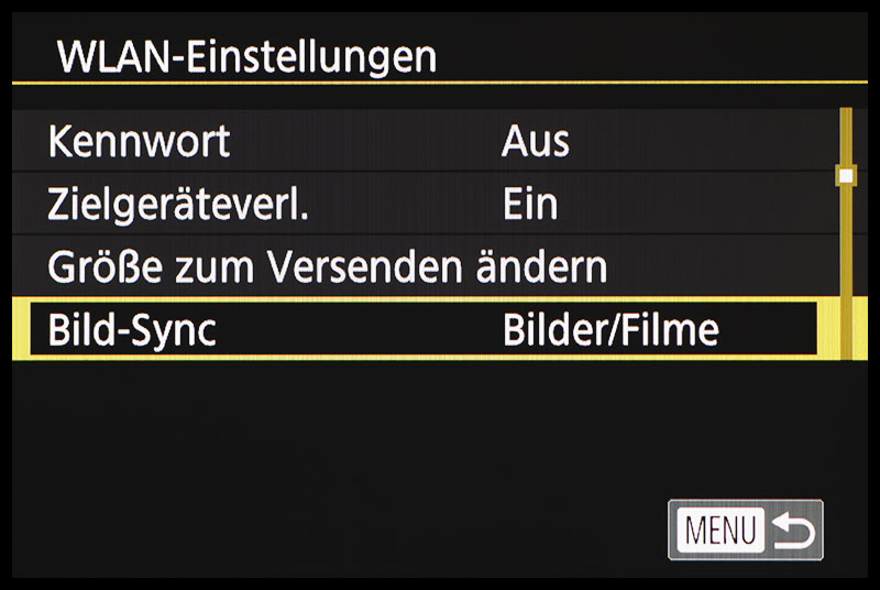 So, fast geschafft. Öffnen Sie in der Kamera im Einstellungsmenü den Eintrag WLAN-Einstellungen und legen Sie bei Bild-Sync fest, ob nur Bilder oder Bilder/Filme übertragen werden sollen.