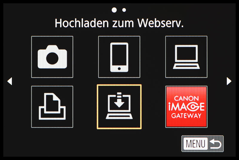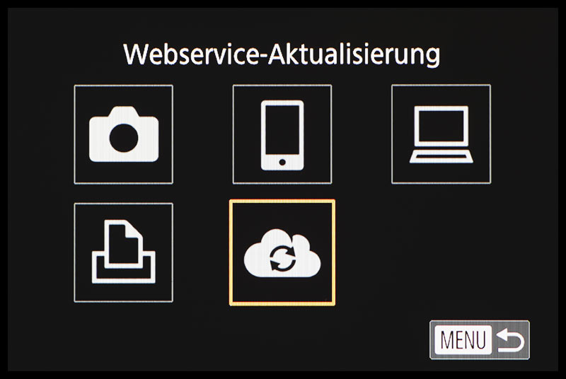 Wählen Sie anschließend im Menü der WLAN-Funktionen Ihrer Kamera das Wolkensymbol mit dem Aktualisierungspfeil aus und bestätigen dies mit Q/SET.