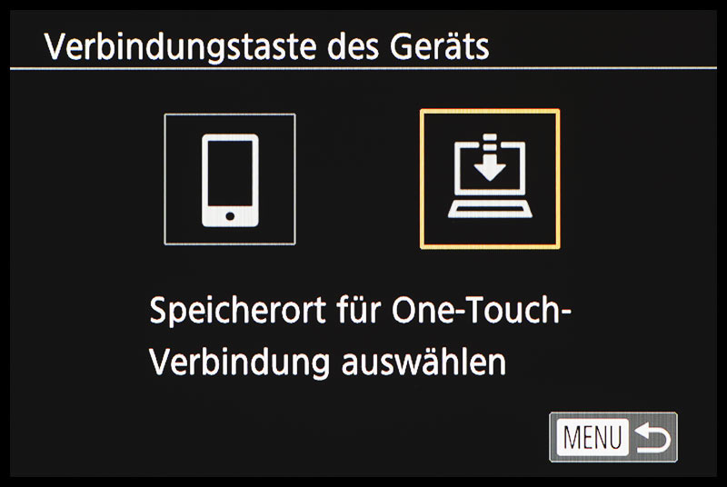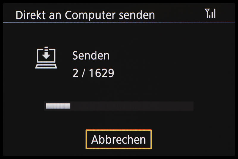 Um jetzt endlich mit der Übertragung der Bilder (und Filme) von der Speicherkarte über die Image Transfer Utility in den gewählten Festplattenordner des Computers beginnen zu können, rufen Sie wieder die WLAN-Funktionen Ihrer Kamera auf und bestätigen das Symbol