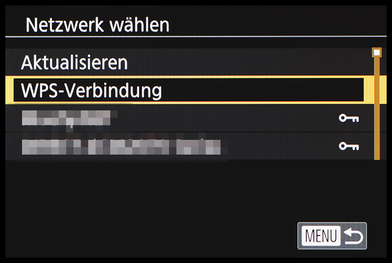 Wählen Sie nun an der Kamera das Netzwerk aus, über das die Verbindung zum heimischen WLAN-Netz aufgebaut werden soll. Am einfachsten lässt sich die Verbindung mit der WPS-Methode einrichten. Wählen Sie also WPS-Verbindung und dann PBC-Methode (Push Button Connection). Drücken Sie nun am WLAN-Router die WPS-Taste, so dass die Verbindung zwischen Kamera und Computer hergestellt werden kann. Alternativ lässt sich die Verbindung natürlich auch mit einem der angezeigten Netzwerke herstellen. Dafür muss der entsprechende Netzwerkschlüssel (Passwort) bekannt sein und in das Eingabefeld am Kameramonitor eingetragen werden.