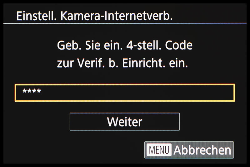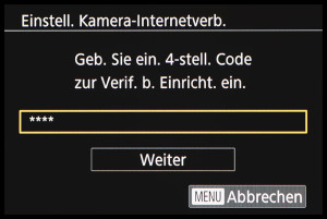 Geben Sie im nächsten Eingabefeld eine vierstellige Nummer ein, die Sie sich selbst ausdenken können. Diese wird benötigt, um die Kamera und ihr Canon iMAGE GATEWAY-Konto miteinander zu verbinden. Wählen Sie dann wieder die Schaltfläche Weiter. und bestätigen Sie nach einer kurzen Pause in nachfolgenden Informations-Bildschirm die Schaltfläche OK.