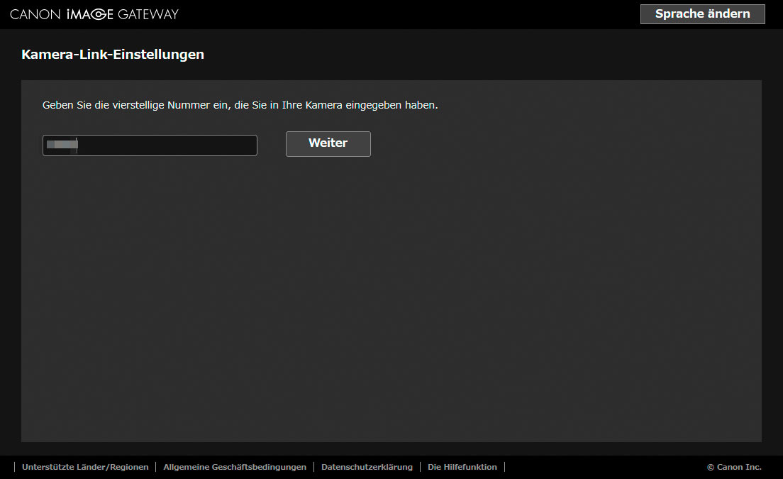 Canon hat Ihnen eine E-Mail gesendet, die den Link zu iMAGE GATEWAY beinhaltet. Wählen Sie diesen aus, um auf die entsprechende Internetseite weitergeleitet zu werden. Dort tippen Sie die vierstellige Nummer ein, die Sie zuvor in der Kamera eingetragen haben und klicken dann auf Weiter.