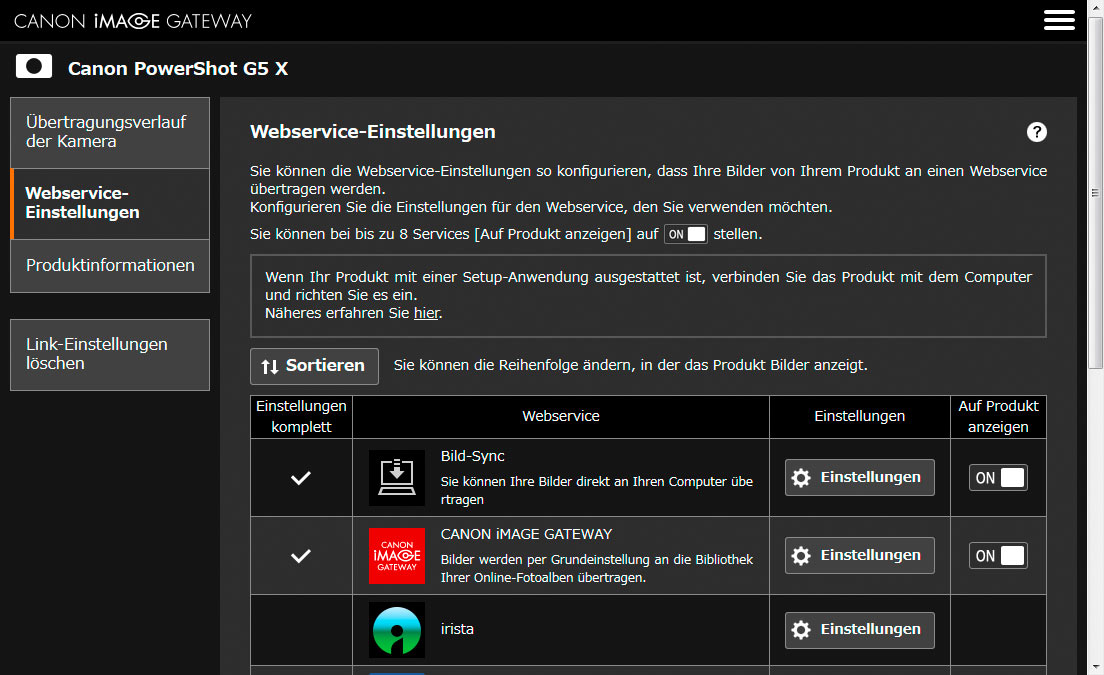 Die Kamera ist nun über das heimische Netzwerk mit CANON iMAGE GATEWAY verbunden. Auf den Seiten von CANON iMAGE GATEWAY können Sie über die Schaltfläche Webservice-Einstellungen angeben, welche Optionen aktiv sein sollen und welche nicht. Wichtig für die Übertragung der Bilder und Videos von der Kamera auf die Festplatte des Computers ist, dass die Option Bild-Sync eingeschaltet ist.