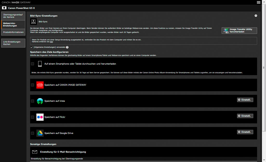 Bei den Einstellungen von Bild-Sync wiederum können Sie alle Optionen deaktivieren, so dass die Bilder nur auf den Computer übertragen werden und nicht auch im Onlinespeicher von CANON iMAGE GATEWAY oder auf anderen Online-Plattformen landen.