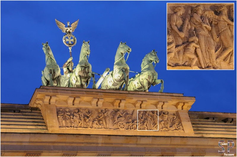 Selbst bei herangezoomten Motiven, hier der Quadriga auf dem Brandenburger Tor, sind im Modus „Nachtaufnahmen ohne Stativ“ alle Details gut zu erkennen (1⁄30 Sek., f 5.6, ISO 3200, 50 mm).