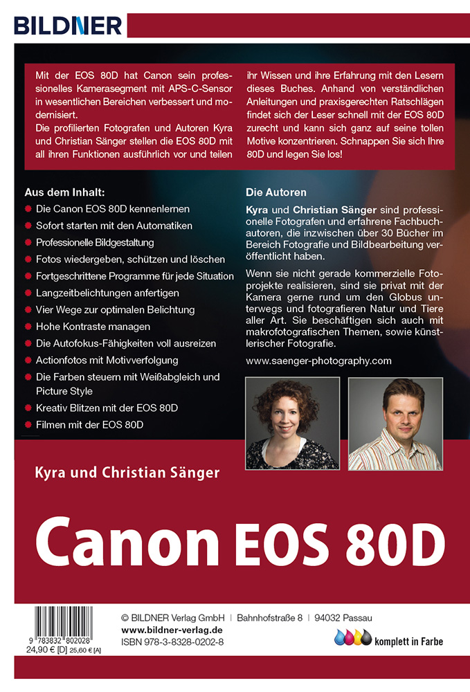 Mit der EOS 80D hat Canon sein professionelles Kamerasegment mit APS-C-Sensor in wesentlichen Bereichen verbessert und modernisiert. Die profilierten Fotografen und Autoren Kyra und Christian Sänger stellen die EOS 80D mit all ihren Funktionen ausführlich vor und teilen ihr Wissen und ihre Erfahrung mit den Lesern dieses Buches. Anhand von verständlichen Anleitungen und praxis-gerechten Ratschlägen findet sich der Leser schnell mit der EOS 80D zurecht und kann sich ganz auf seine tollen Motive konzentrieren. Schnappen Sie sich Ihre 80D und legen Sie los!