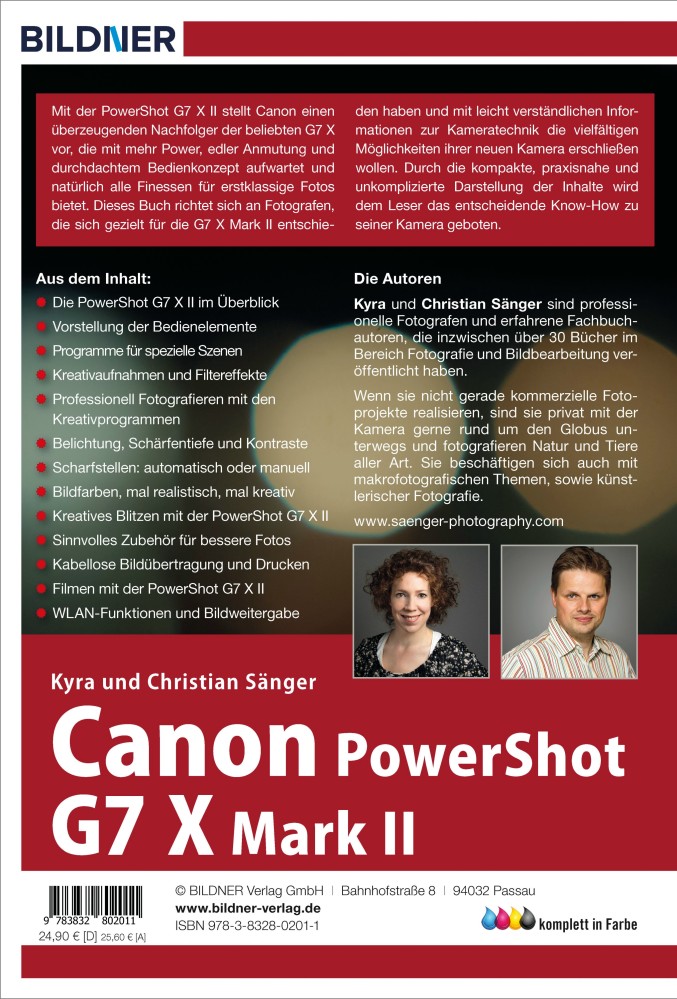 Mit der PowerShot G7 X Mark II hat Canon dem Erfolgsmodell G7 X eine Frischzellenkur verpasst und die Leistungsfähigkeit deutlich verbessert. Wie Sie unkompliziert starten und dann Stück für Stück alles aus Ihrer G7 X Mark II herausholen, zeigen wir Ihnen ausführlich in unserem speziell auf die Kamera zugeschnittenen Handbuch. Wir wünschen Ihnen beim kreativen Entdecken der zahlreichen Funktionen Ihrer neuen fotografischen Begleiterin viel Spaß! Lassen Sie sich durch praxisbezogene Beispiele zu eigenen Ideen inspirieren und reizen Sie das Potenzial ihrer High-end-Kamera voll aus.