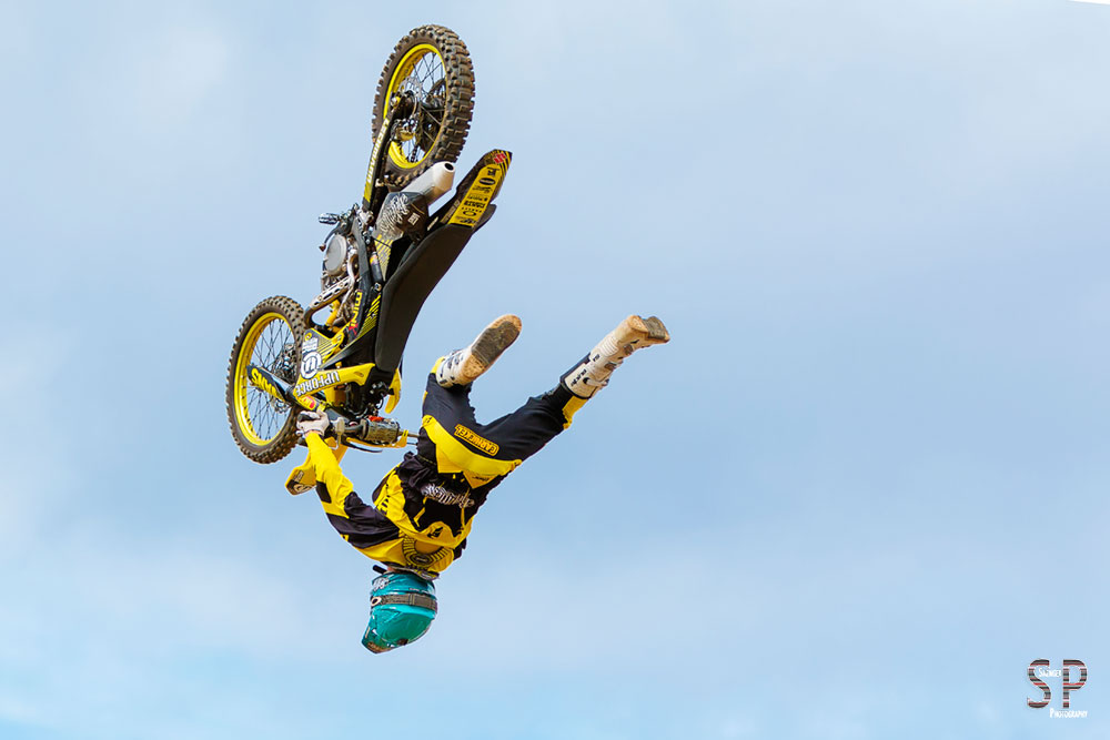 Übrigens, so ein springender, bunt gekleideter Motocrossfahrer kann mit seiner Maschine tatsächlich auch vor einem eher wolkenverhangenen Himmel ganz gut zur Geltung kommen. Es lohnt sich also, auch bei eher moderatem Wetter die Kamera in die Hand zu nehmen und solch eine Veranstaltung zu besuchen – quod erat demonstrandum.