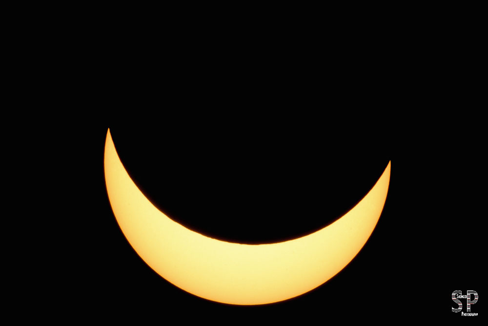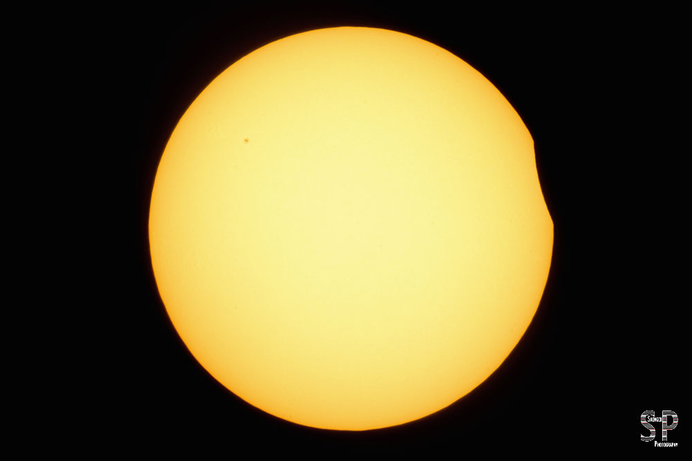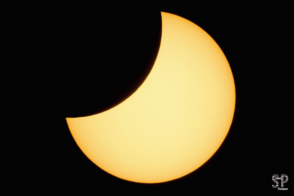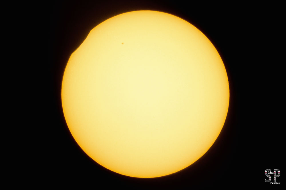 Bei dem 500er haben wir, in Ermangelung eines Filters im Bratpfannenformat, eine handelsübliche gold-silberne Rettungsdecke über die Sonnenblende gezogen (silberne Seite zur Sonne) und mit Einmachgummis befestigt. Das hatte schon bei dem Venustransit 2012 sehr gut funktioniert. Fertig war der technische Aufbau, um Sonne und die sich davorschiebende Mondscheibe adäquat auf den Chip zu bannen. Hierzu war es allerdings notwendig, mit den Belichtungsparametern ins Extreme zu gehen. Soll heißen, dem sehr hohen Blendenwert von f51-64 wurde eine Belichtungszeit von 1/8000 s bei ISO 100 zur Seite gestellt. Unser Vorversuch, die Folie doppelt zu nehmen, um die Werte nach unten regulieren zu können, resultierte in einer deutlich schlechteren Bildqualität, was für uns natürlich nicht akzeptabel war.