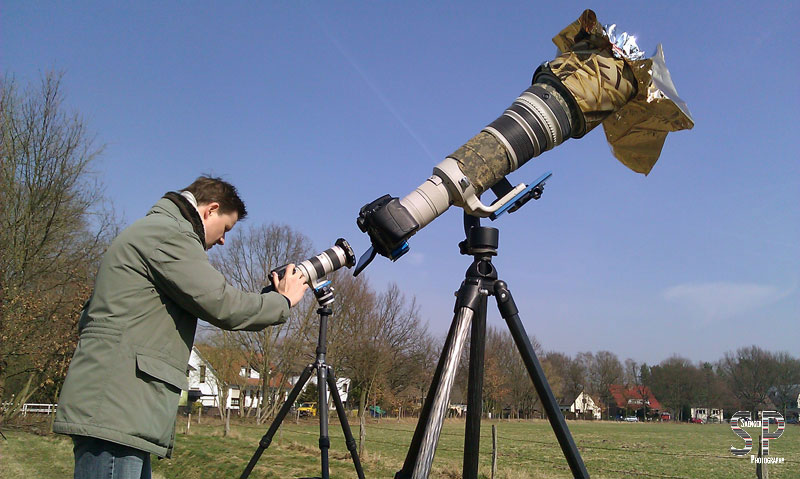 Aufgrund des super Wetters konnten wir auf eine längere Fahrt, um etwaigen Wolken zu entfliehen, verzichten und haben unsere Kameras ganz bequem direkt am Rande einer Weide in Berlin-Heilgensee aufgestellt. Die eine Kamera wurde bestückt mit einem 70-200 mm Objektiv plus 1,4fach-Konverter und die andere mit einem 500 mm-Festwinkelobjektiv und 2fach-Konverter, um das Ereignis auch schön groß abgebildet zu bekommen.