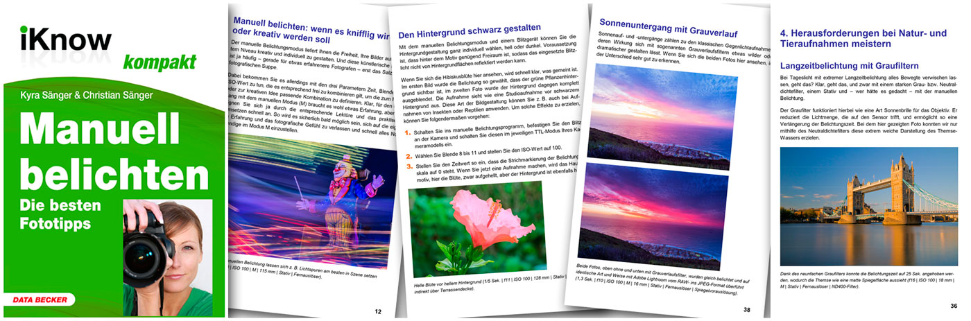 Es gibt ungeahnt viele Situationen, in denen die manuelle Belichtung all den ausgefeilten Automatiken moderner Kameras immer noch überlegen ist. Um wirklich tolle Bilder zu generieren heißt es also, ran an die Einstellungen von Zeit, Blende und ISO. In unserem neuen Buch aus der iKnow E-Book-Serie haben wir uns speziell dieser Thematik gewidmet. So erfahrt ihr auf 68 Seiten alles über die manuelle Belichtung, natürlich stets ganz ganz eng abgestimmt auf die jeweilige Fotosituation. Das Buch liefert viele Praxisanleitungen, mit denen z. B. Nachtporträts, Sonnenuntergänge, Makrofotos, Panoramen etc. spielend leicht in ansprechende Bilder umgesetzt werden können.