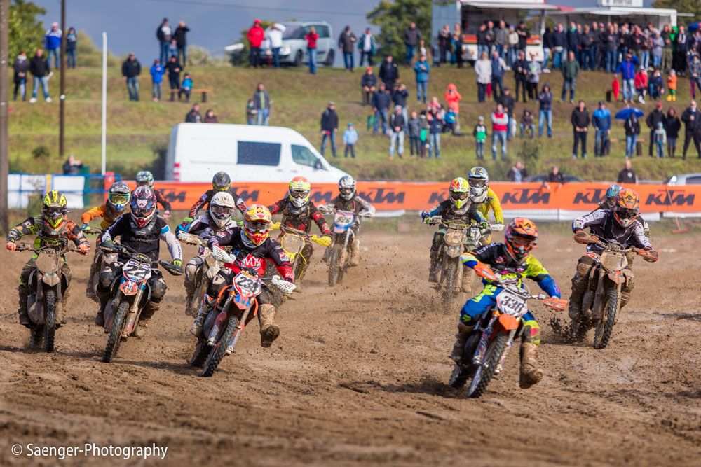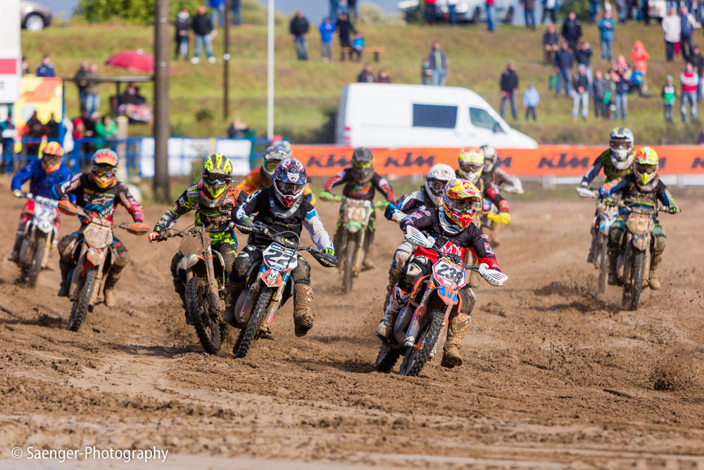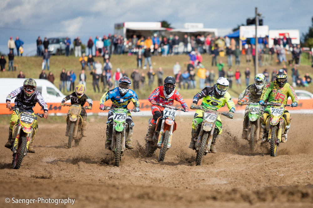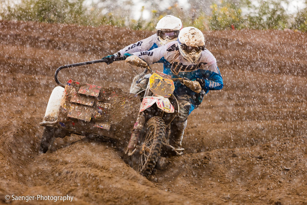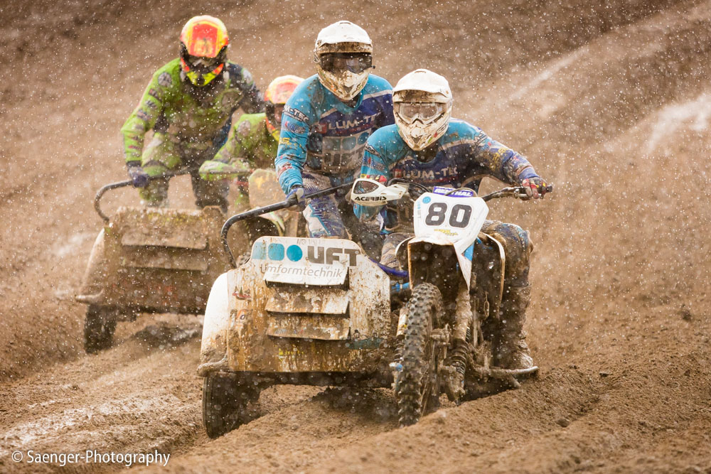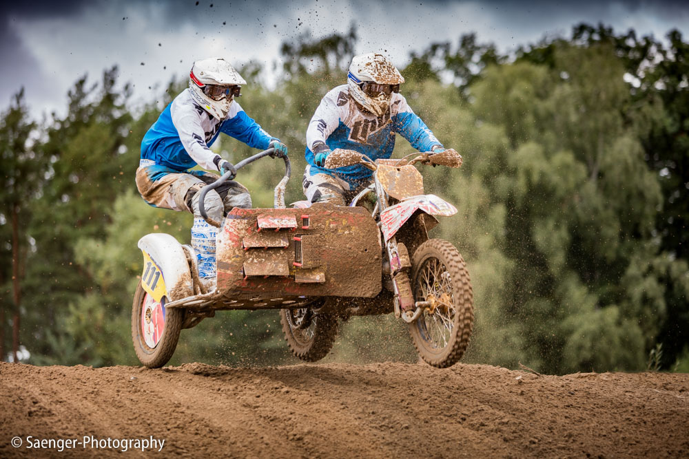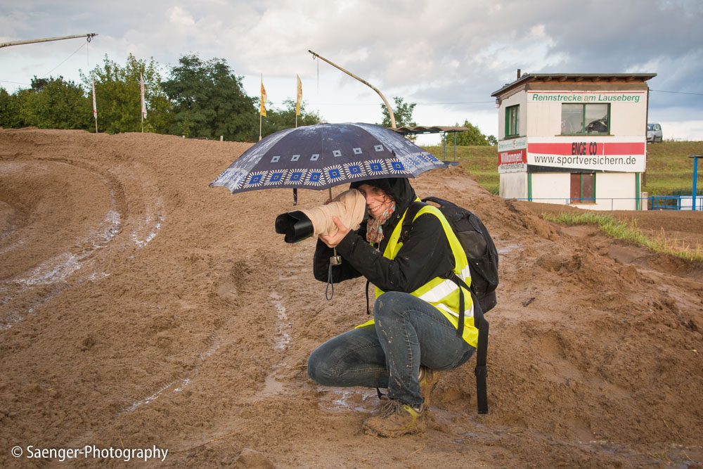 Letztes Wochenende haben wir es uns trotz äußerst unbeständigen Wetters nicht nehmen lassen, in ein Waldgebiet südwestlich von Berlin zu fahren. Dort liegt die Rennstrecke des MCC Schenkenhorst, auf der die Läufe zur Berlin-Brandenburgischen Meisterschaft im Motocross (LMBB 85), zum Deutschen Motocross-Pokal MX1 und das Finale der Deutschen Meisterschaft 2015 im Seitenwagen-Motocross stattgefunden haben. Das Wetter war richtig schön unberechenbar und wechselte alle Viertelstunde zwischen Sonne, bedrohlich aussehenden dunklen Wolkenbergen und den dazugehörigen heftigen Schauern, so dass sich die Rennstrecke in eine richtig schöne Matschkuhle verwandelte. Wir sahen am Ende dann auch entsprechend Dreckverkrustet aus, zumal die Fahrer beim Beschleunigen natürlich keine Rücksicht auf bedauernswerte an der Strecke im Schlamm stehende Fotografen nehmen konnten, und uns die nassen Sandklumpen nur so um die Ohren gezischt sind. Nun ja, wer will`s ihnen verdenken, Sie hatten schließlich eine Meisterschaft zu gewinnen.