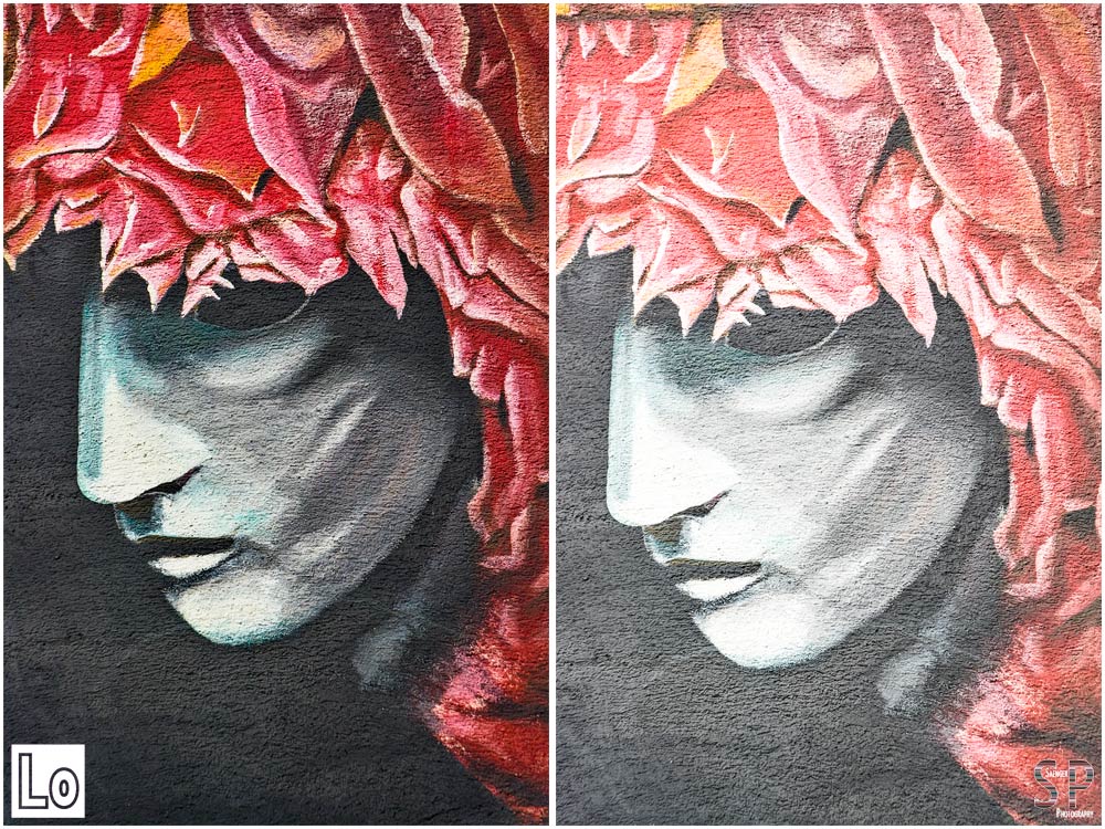 Mit dem EFFECTS-Modus „Lo“ (links) konnte das dunkle Motiv auch ohne Belichtungskorrektur richtig belichtet aufgenommen werden, während die bemalte Hausfassade im Motivprogramm Landschaft (rechts) zu hell geworden ist.