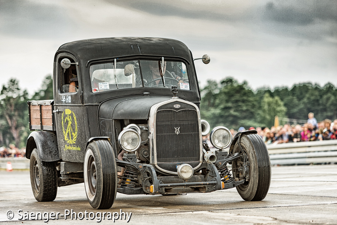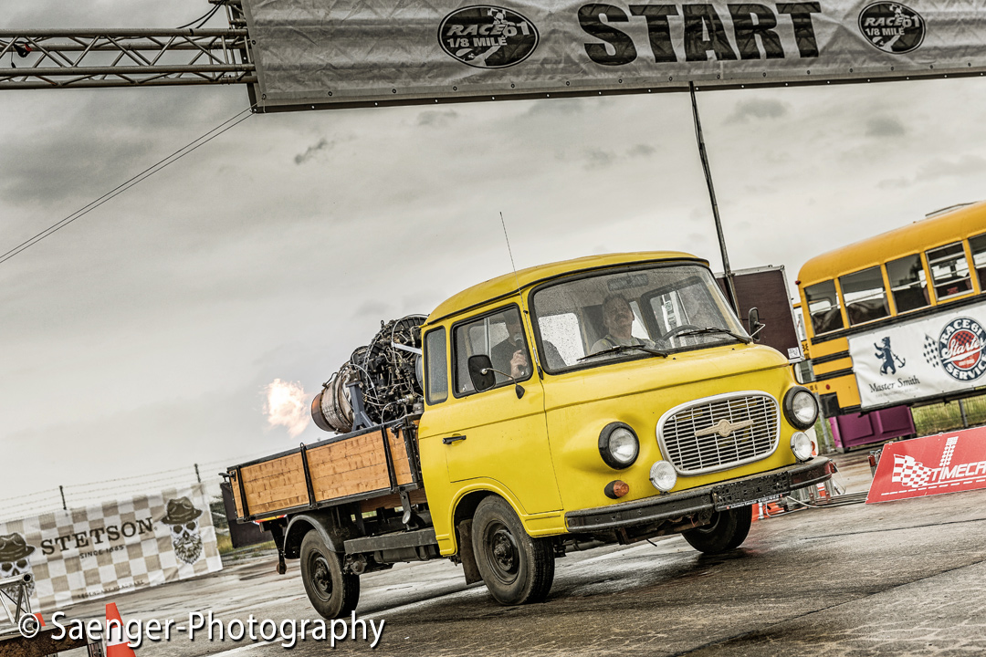 Dann hatte der Hot-Rod Gott aber zum Glück ein Einsehen mit Fahrzeugen, Veranstaltern und Fahrern, und die Piste begann langsam zu trocknen. Just for fun und auch, um diesen Prozess wirkungsvoll zu unterstützen, holten die Museumsbetreiber ein schier unglaubliches Gefährt aus dem Hangar. Luftfahrttechnisch äußerst bewanderte Spaßvögel hatten ein Düsentriebwerk auf einen alten Barkas-Transporter montiert und wollten damit allen Ernstes über die Piste brettern. Wir waren skeptisch, aber von wegen, das Triebwerk wurde gezündet und nachdem die Düse sich warmgeblasen hatte, gab der Straßen-Chefpilot am Steuer mal so richtig Kerosin und ja, das Teil legte los, wie ein Düsenjäger und klang auch so.