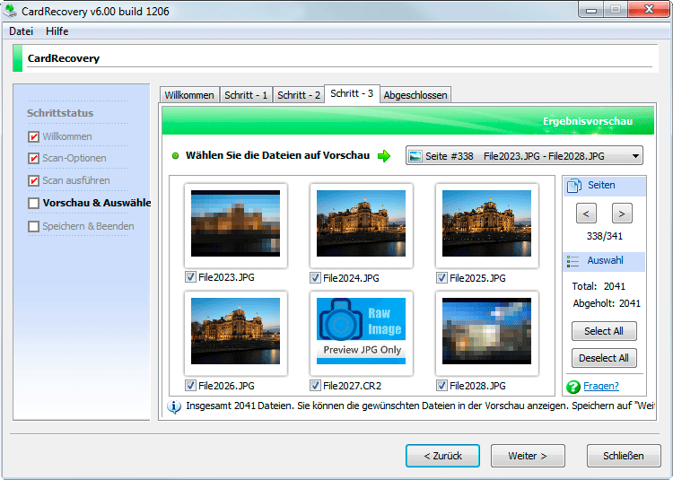 Bei beiden Softwareprogrammen kann man die Art der zu erwartenden Daten vorgeben, also beispielsweise Bilder oder Videos. Anschließend wird die gesamte Speicherkarte ausgelesen und alle gefundenen Bilder angezeigt. Diese können schließlich einzeln oder alle auf einmal im Computerordner gespeichert werden. Der Scanvorgang ist mit den Freeware-Versionen noch machbar, für die Speicherung der Bilder muss die jeweilige Software dann allerdings erworben werden.