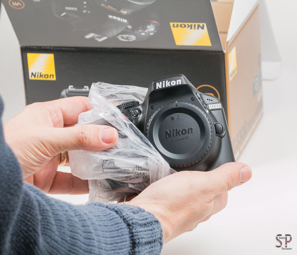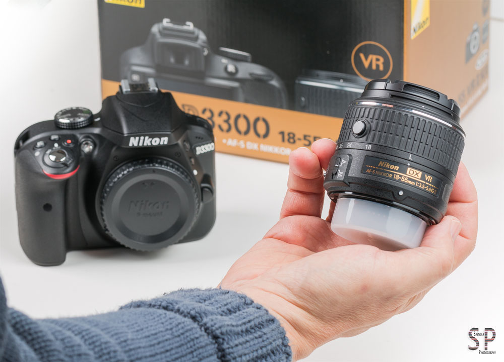 Sodann angeln wir das 18-55 mm Objektiv und das Kameragehäuse aus der Verpackung. Was gleich auffällt, sowohl Kamera als auch Objektiv kommen extrem leicht daher. Nach Konsultation der Spezifikationen wissen wir, dass das Gehäuse mit 460 g ca. 45 g weniger auf die Waage bringt als die D3200. Mit Objektiv sind es insgesamt sogar ca. 100 g weniger. Nimmt man das Objektiv in die Hand fällt allerdings auch auf, dass Nikon uns hier einen richtigen Plastikbomber serviert hat. Etwas günstig gemacht wirkt es schon, das neue Kit-Standardobjektiv. Vor allem die durchsichtige Aufsteckplastikkappe für den Bajonettanschluss wirkt, als wäre sie mal eben aus einem Kaugummiautomaten gezogen worden. Nun ja, wir werden ja demnächst sehen, inwieweit das gute Stück sich in der Praxis bewährt.