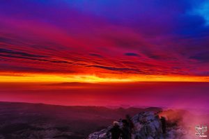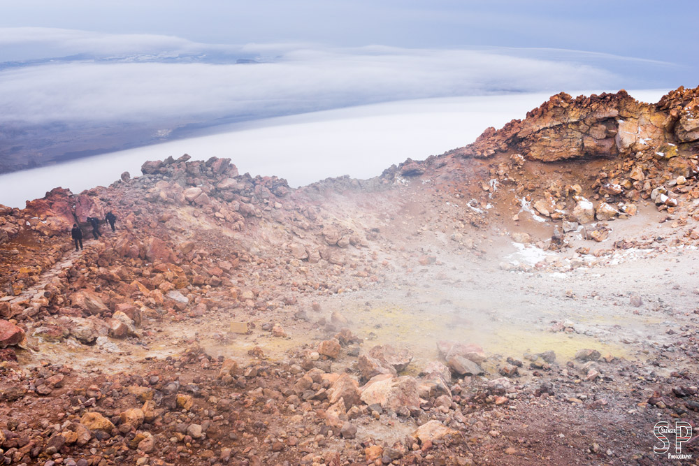 Das Ganze geschah auf exakt 3719 Metern Höhe über dem Meer, denn wir hatten morgens um 7:20 Uhr den Gipfel des Vulkans Teide, den El Pilón, erklettert. Eine für geübte Bergsteiger alpinistisch an sich eher einfache Übung, aber im Winter bei über 3000 Meter und vereisten Pfaden, dazu im Dunkeln mit Taschenlampe, dann doch nicht völlig ohne eine gewisse Kondition und Erfahrung zu bewerkstelligen. Zumindest sah der Ein oder Andere, der mit uns auf den Gipfel steigenden Sonnenaufgansenthusiasten, nicht ganz so optimal um die Nase herum aus und das lag nicht ausschließlich an den erheblich nach faulen Eiern stinkenden Schwefelwasserstoffdämpfen am Gipfelkrater, die ca. 85°C warm aus den Steinspalten quollen.